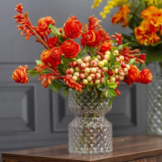 This spray measures 42cm tall. The open flower measures 4.5cm in diameter, and the buds measure 3.5cm in diameter.