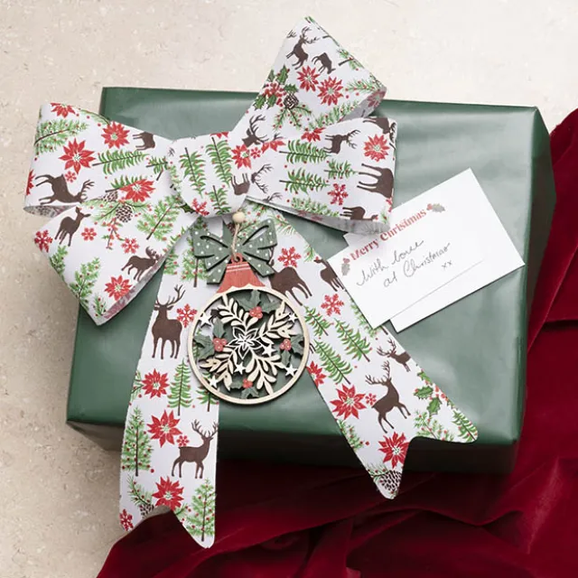 The front of the bow is a natural fabric and has a PVC backing, enabling it to always hold its shape. Featuring easy-to-use twist tie attachments, this bow is a surefire way to add a polished yet fun touch to your gifts and decor this holiday season.