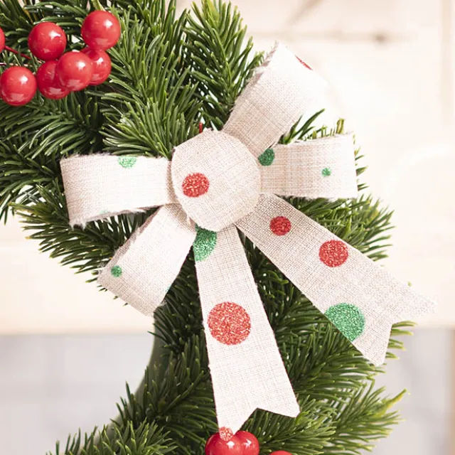 The front of the bow has a natural fabric with a PVC backing, enabling it to always holdits shape. Featuring easy-to-use twist tie attachments, this bow is a surefire way to add a polished yet fun touch to your giftsand decor this holiday season.