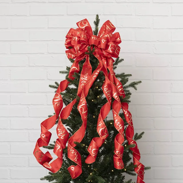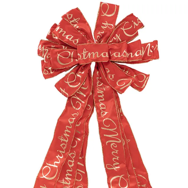 This tree topper bow features a red satin ribbon with gold Merry Christmas print and is 60mm wide and has 16 loops at the top.