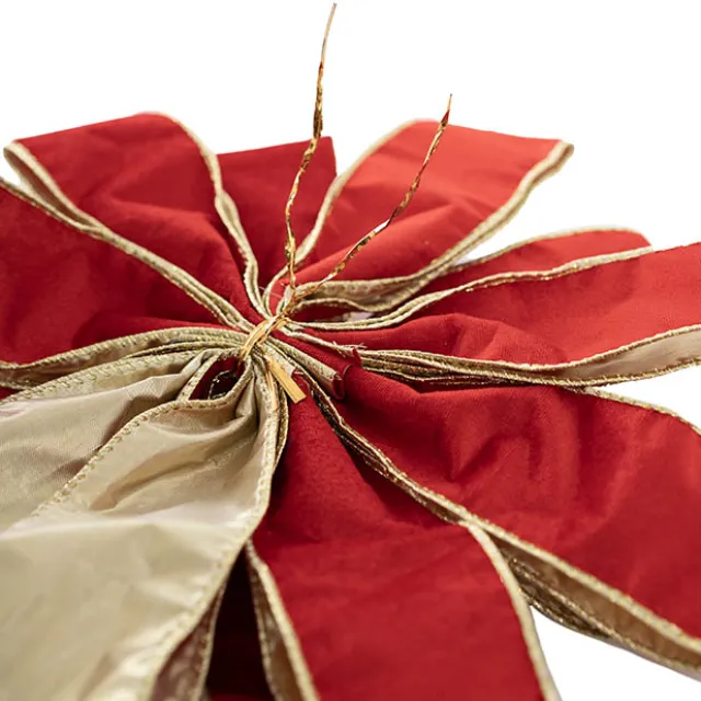 This tree topper bow features Red velvet ribbon with contrasting gold backing and gold trim. The ribbon is 65mm wide and has 14 loops at the top.