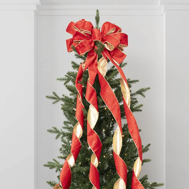 This tree topper bow features Red velvet ribbon with contrasting gold backing and gold trim. The ribbon is 65mm wide and has 14 loops at the top.