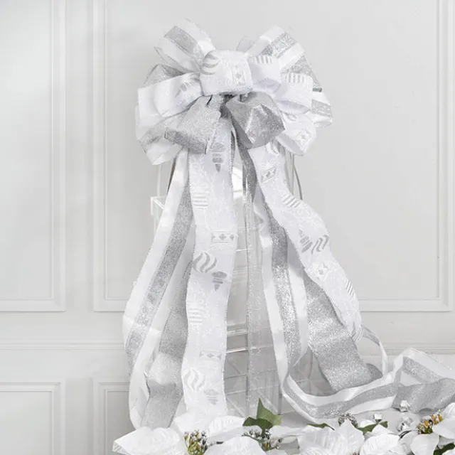 White satin & silver glitter ribbon that is 60mm wide and has 4 loops at the top.