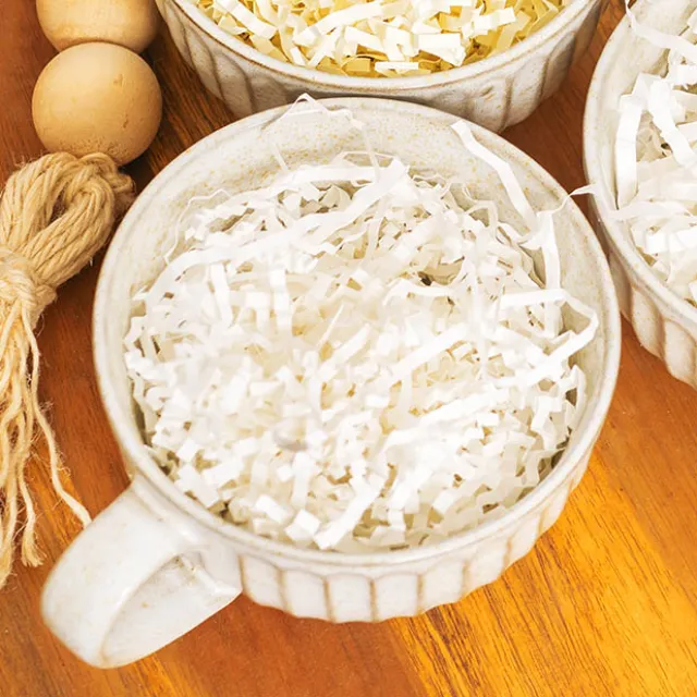 Our shred is composed of 3mm wide crinkle-cut strips and made from 80gsm paper. It is available in 150-gram bags.