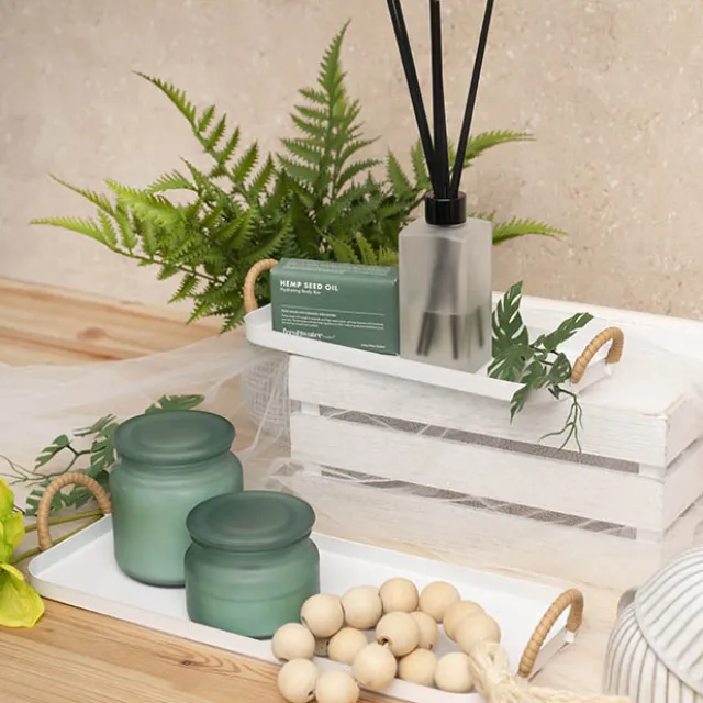 Sold in a set of two, the smaller tray measures 31.5cm long, 12cm wide, and 5.5cm tall. The larger tray measures 43cm long, 16.5cm wide, and 6cm tall.