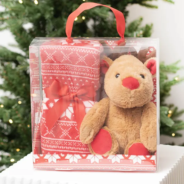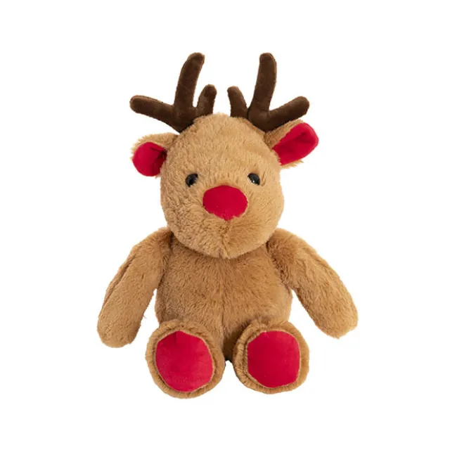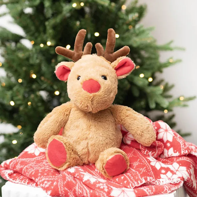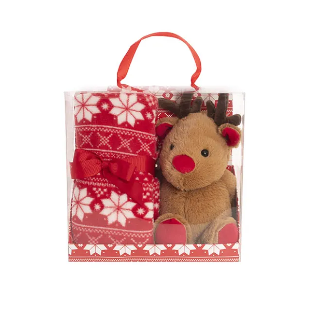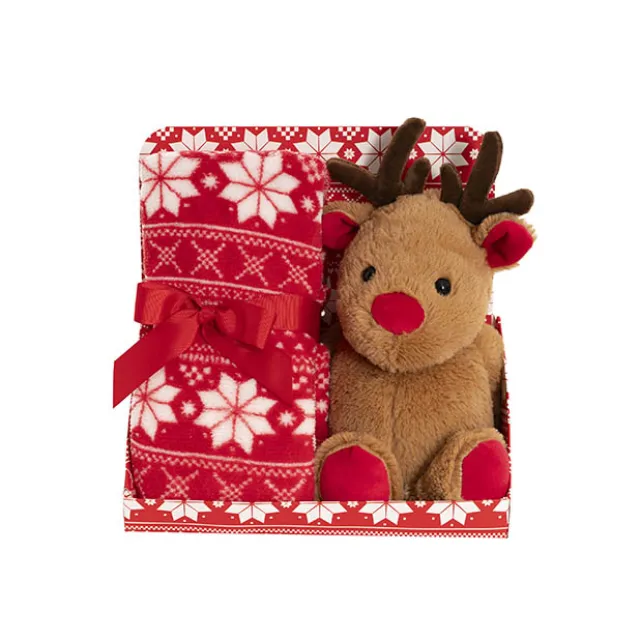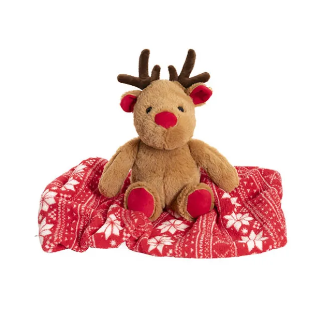 The reindeer measures 33cm tall with floppy legs and sits 25cm tall. The blanket measures 90cm long and 75cm wide.