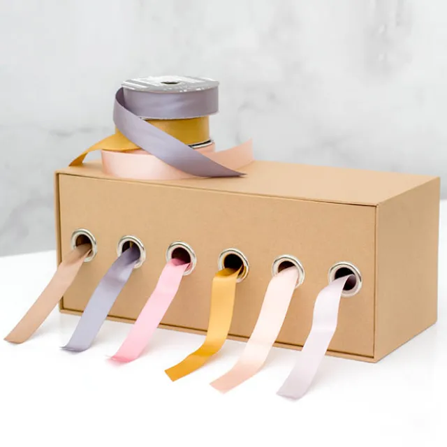 This dispenser box has the added benefit of being easy to carry and also being stackable. The ribbon storage box includes 6 holes where ribbon can be threaded through.