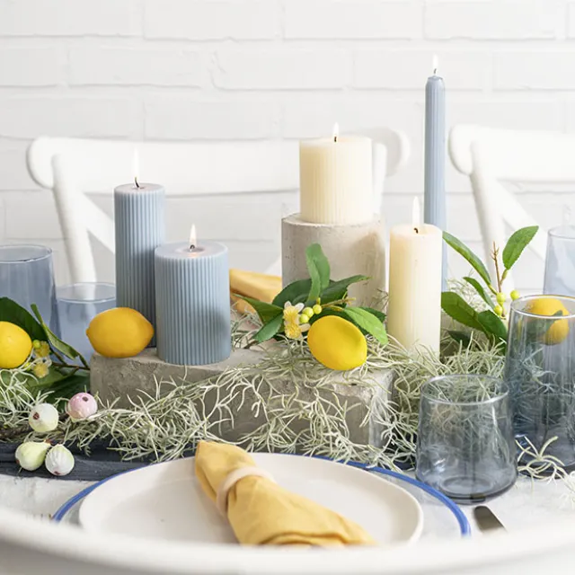 Our Roman Fluted Pillar Candle in French Blue is a plain-coloured ribbed candle that will bring textural interest to your event and home decor. Pair with other products from our Roman Fluted candle range for a complementary cluster. This candle is dripless.