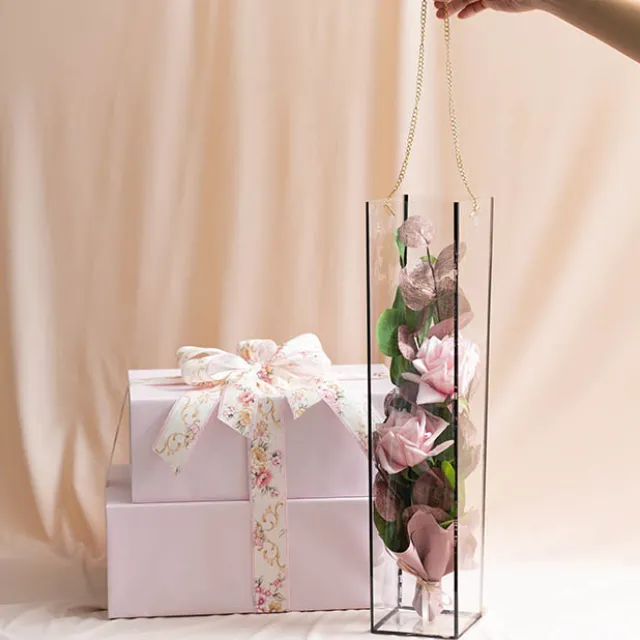 This is a lovely square cylinder for flowers, confectionary and general packaging ideas for Valentine’s Day. You can use with clear cellophane shred, coloured flower wrap, crystal rocks or other decorative pebbles in the base. Beautifully displays a single rose or flower of your choice. Add a gift tag and bow and you have a perfect gift.
