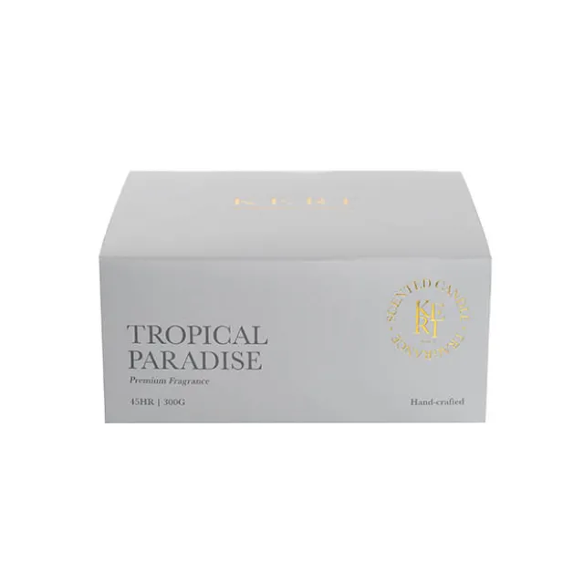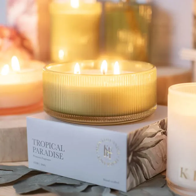 Our three-wick Indulgence Tropical Paradise candle multiplies the pleasure with three sources of flame, enhancing the fragrance throw. It envelops your surroundings with an intoxicating blend of tropical fruit and floral scents, reminiscent of a lush rainforest. Handmade with natural soy blend wax and premium fragrances, this candle is a true luxury for the senses.