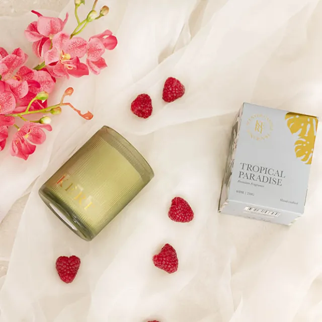 Embark on a sensory journey to the tropics with our Indulgence Tropical Paradise scented candle. This candle blends the lush scents of exotic fruits and tropical blooms, creating an inviting aroma that transports you to an island paradise. Handcrafted with natural soy blend wax and featuring lead-free, smoke-free wicks, it ensures an impeccable burn and aromatic experience.
