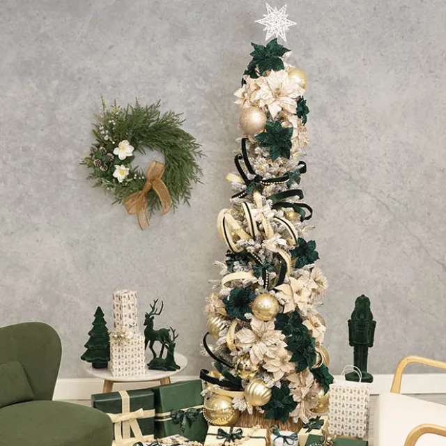This voluminous artificial pine tree features over 1,100 snowy branch tips and 250 LED lights. With an easy-shape assembly model, this pencil tree makes Christmas tree assembly no-fuss and all-fun.