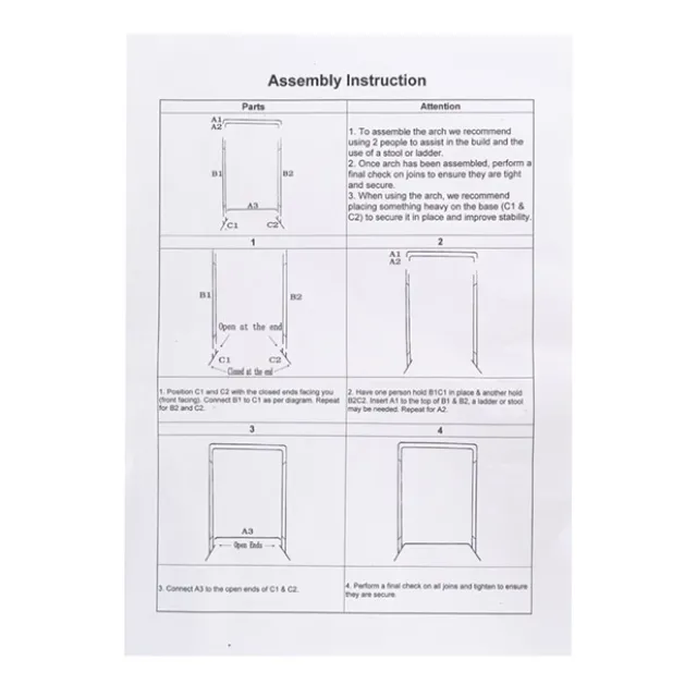 The metal arch is flat packed in one carton weighing 6.5kg and measures 205x28x7cmH. It consists of 7 pieces that are easy to assemble. Instructions are included in the pack.