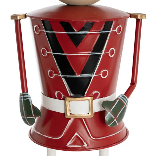 This lightweight hollow metal nutcracker combines classic charm with modern flair. His pointed dome crown features intricate gold, black, and white detailing that complements his elaborate coat. He wears plaid mittens and sports rosy cheeks along with a big, white moustache, adding a playful touch to his traditional look.