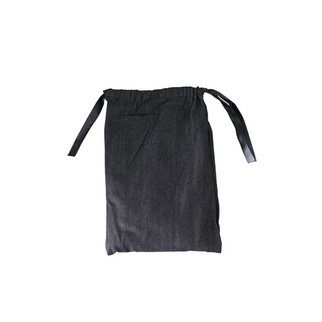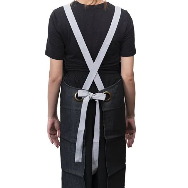 This apron is made from durable denim fabric. It has thick supportive straps that are adjustable for comfort. When wearing the apron, you can choose to either crossover the back straps or leave them straight inline with your shoulders. The straps come in 2 individual straps that are leather on the top and fabric on the bottom. To use, simply feed the leather part of the strap through the front eye and secure it with the gold stud. This apron also comes in a handy drawstring bag.