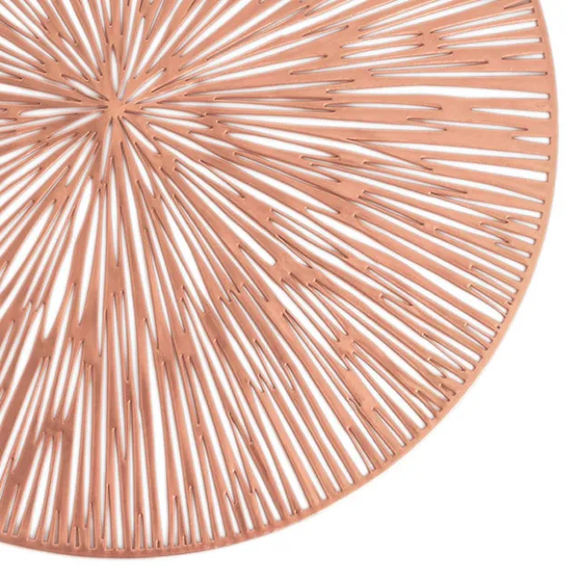 Made of a flexible synthetic textile; this placemat does not only gleam brilliantly, it also has an intricate pattern of cut-outs that allow the underlying table surface to peek through.