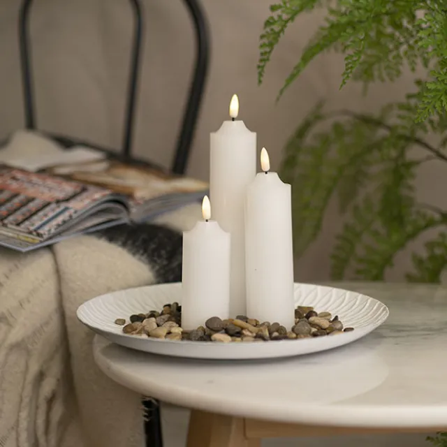 Be mesmerised by the magic of LED candles. This Trueflame™” Flickering LED White pillar candle gives a cosy ambiance like a real candle. It is a safe alternative to decorate your home, weddings and any special events. Featuring real wax, long battery lighting life and a realistic flameless glow.