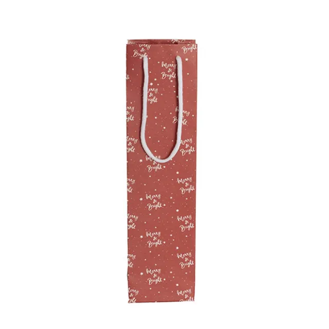 This bag measures 11cm wide, 9cm deep, and 42cm tall, and can contain up to one bottle of wine. The front and back handles are 7.3cm wide and 2.8cm high. The handle sits 2cm from the top with a space of 37cm below the handle and the handle is 1.7cm from the edge of the bag. This product is available in a pack of five.
