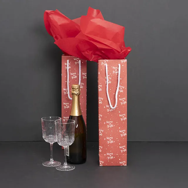 This bag measures 11cm wide, 9cm deep, and 42cm tall, and can contain up to one bottle of wine. The front and back handles are 7.3cm wide and 2.8cm high. The handle sits 2cm from the top with a space of 37cm below the handle and the handle is 1.7cm from the edge of the bag. This product is available in a pack of five.