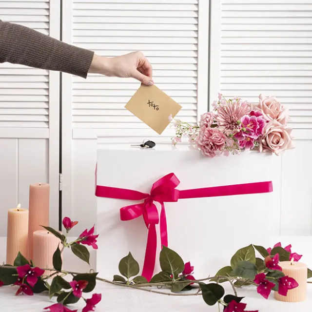 This wishing well measures 40cm in length, 30cm in width, and 30cm in height. Unlike other styles of wishing well, this model does not have a hinged lid at the top; this wishing well opens from the base. The envelope slit sits at the top of the wishing well and measures 1cm wide and 20cm long. This wishing well is sold individually.
