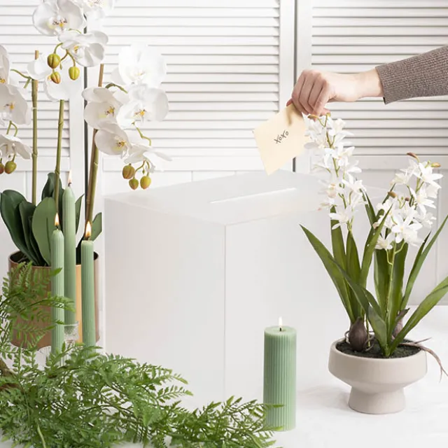 This wishing well measures 40cm in length, 30cm in width, and 30cm in height. Unlike other styles of wishing well, this model does not have a hinged lid at the top; this wishing well opens from the base. The envelope slit sits at the top of the wishing well and measures 1cm wide and 20cm long. This wishing well is sold individually.