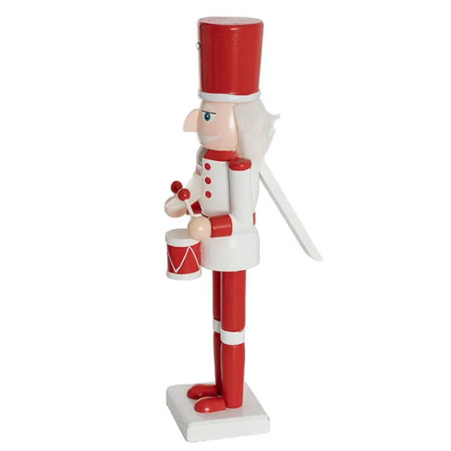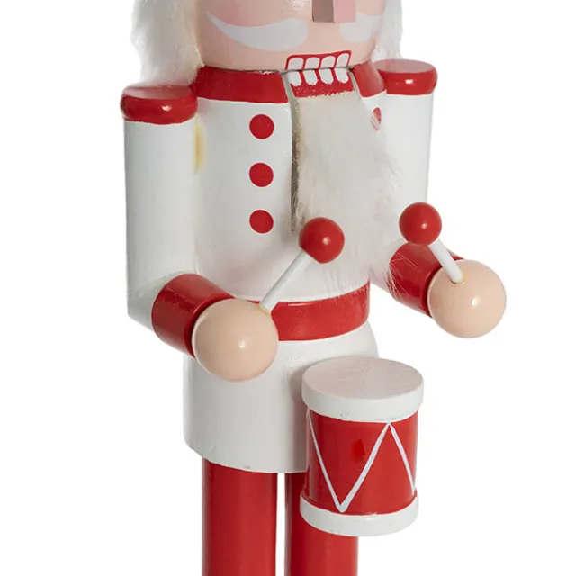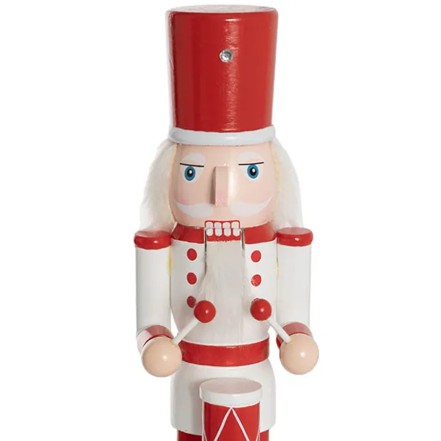 This nutcracker wears a red and white uniform, complemented by a matching drum. Constructed from wood, this nutcracker is perfect for display on mantels, shelves, or entryways, bringing a traditional and cheerful touch to your Christmas decorations.