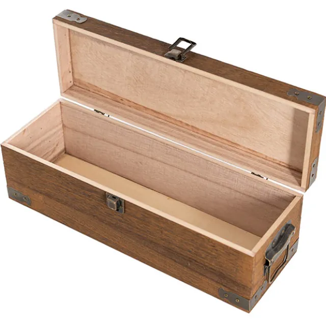 This single wooden wine box is complete with a hinged lid, locking latch, metal handles and metal features on the corners for a rustic antique look. With a brown stain finish on 8mm real timber, the box has a polish for a smooth touch.