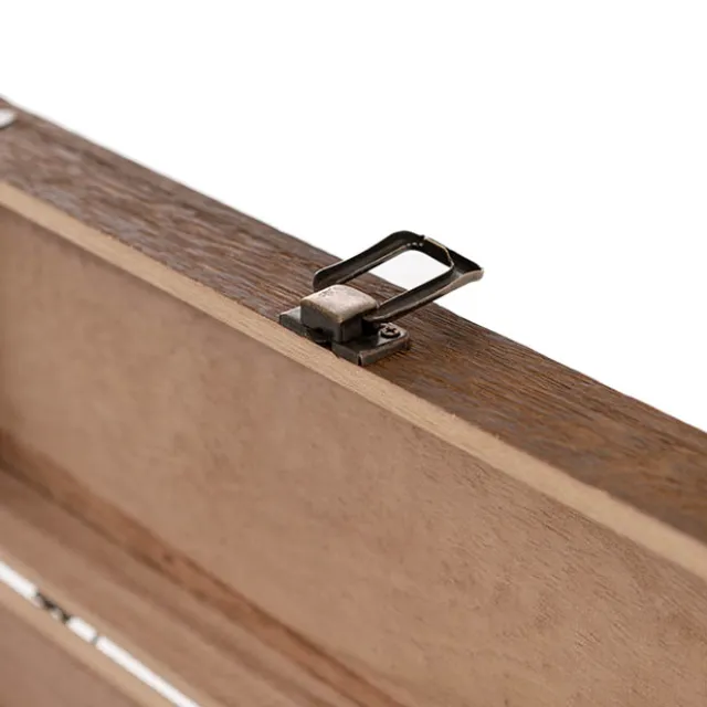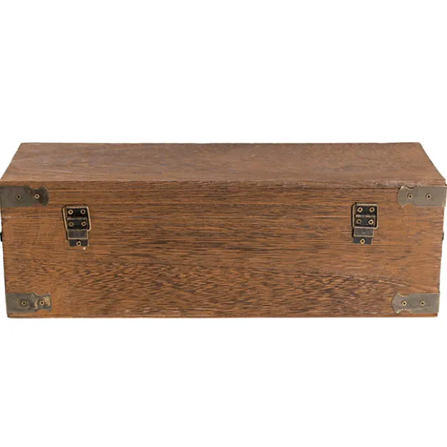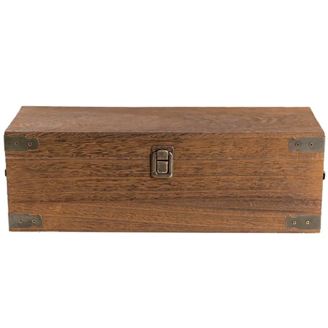 This single wooden wine box is complete with a hinged lid, locking latch, metal handles and metal features on the corners for a rustic antique look. With a brown stain finish on 8mm real timber, the box has a polish for a smooth touch.